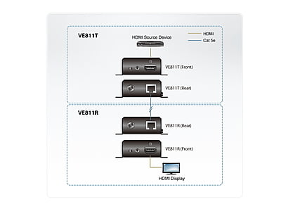 The ATEN VE811 HDMI HDBaseT Extender guarantees the optimum HDMI connection up to 100 m over a single Cat 5e/6/6a or ATEN 2L-2910 Cat 6 cable. The VE811 meets HDMI Specification features including 3D, Deep Color, HD lossless audio formats and CEC pass-through. It supports Dolby Digital 5.1, DTS HD audio and video signals at resolutions up to 4K. In addition, the VE811 supports long reach mode, providing an effective means for extending HDMI signals up to 150m over a single Cat 5e/6 cable.